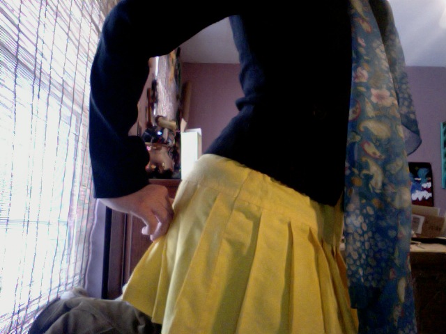 Pretty snazzy, huh? This red shirt was my stepdad's jazz band shirt. He wore it with a white blazer-type coat. Also featured is one way to wear my new hair style--the long part is in two braids, crossed in an X. The short part is in a bun, which has fallen out a bit.
